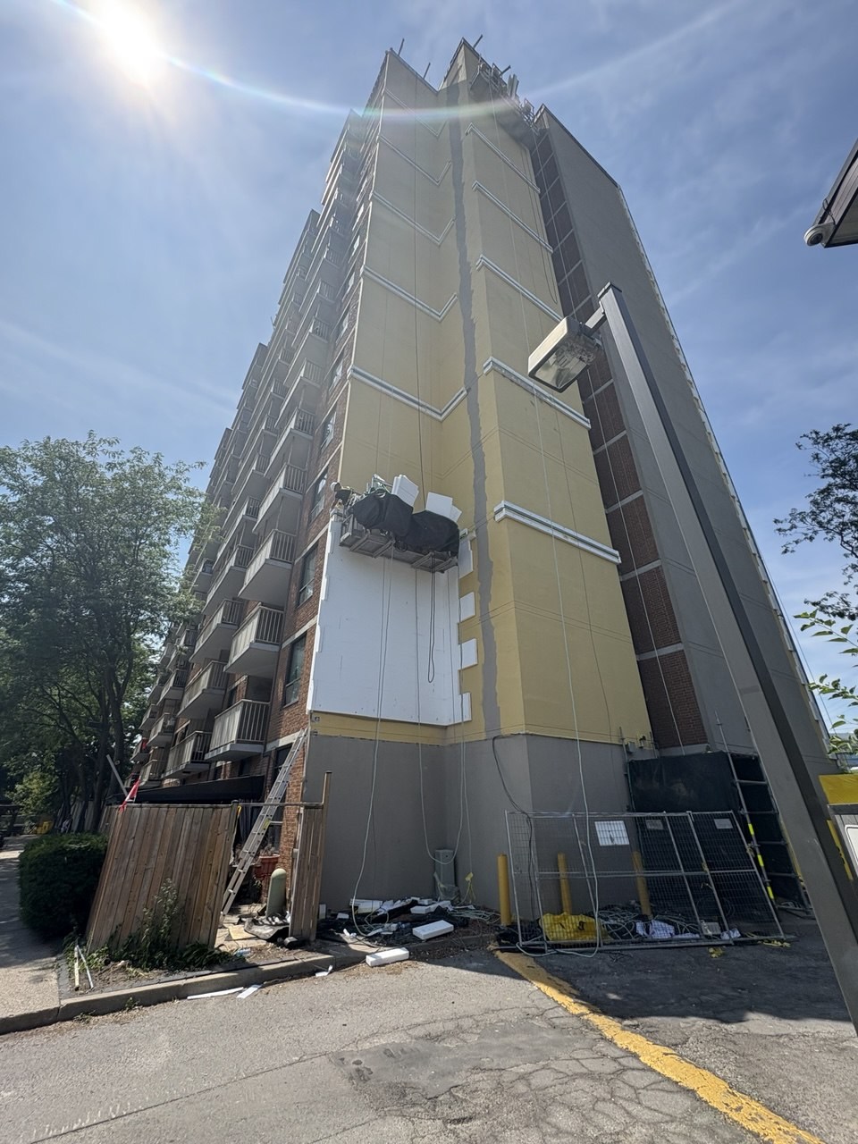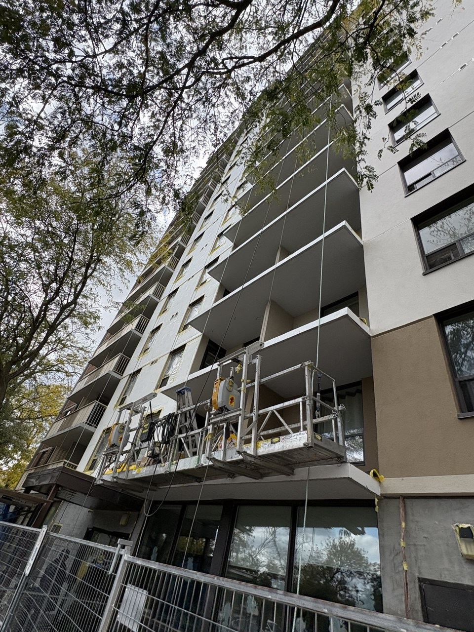 The project involved the installation of a new EIFS (Exterior Insulation and Finish System) façade and replacement of balcony railings, transforming the building’s appearance while significantly improving thermal performance and weather protection.
